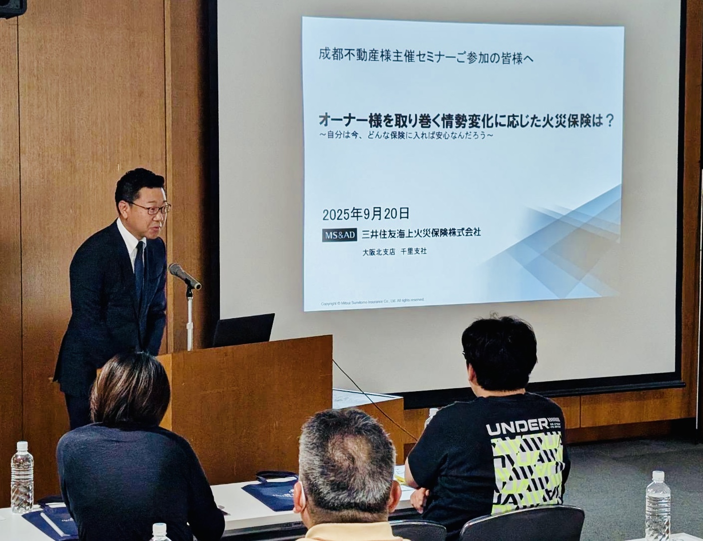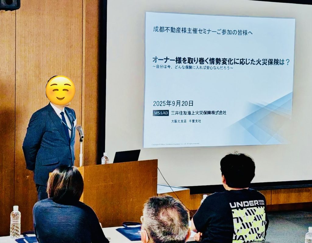 不動産管理業を営む地元の優良企業様主催のセミナーに弊社社員が登壇させていただきました。当日は来場された不動産オーナー約50名様に向けて、火災保険の現況や、見直しのポイント、オーナ様向けの補償についてご説明する機会をいただきました。