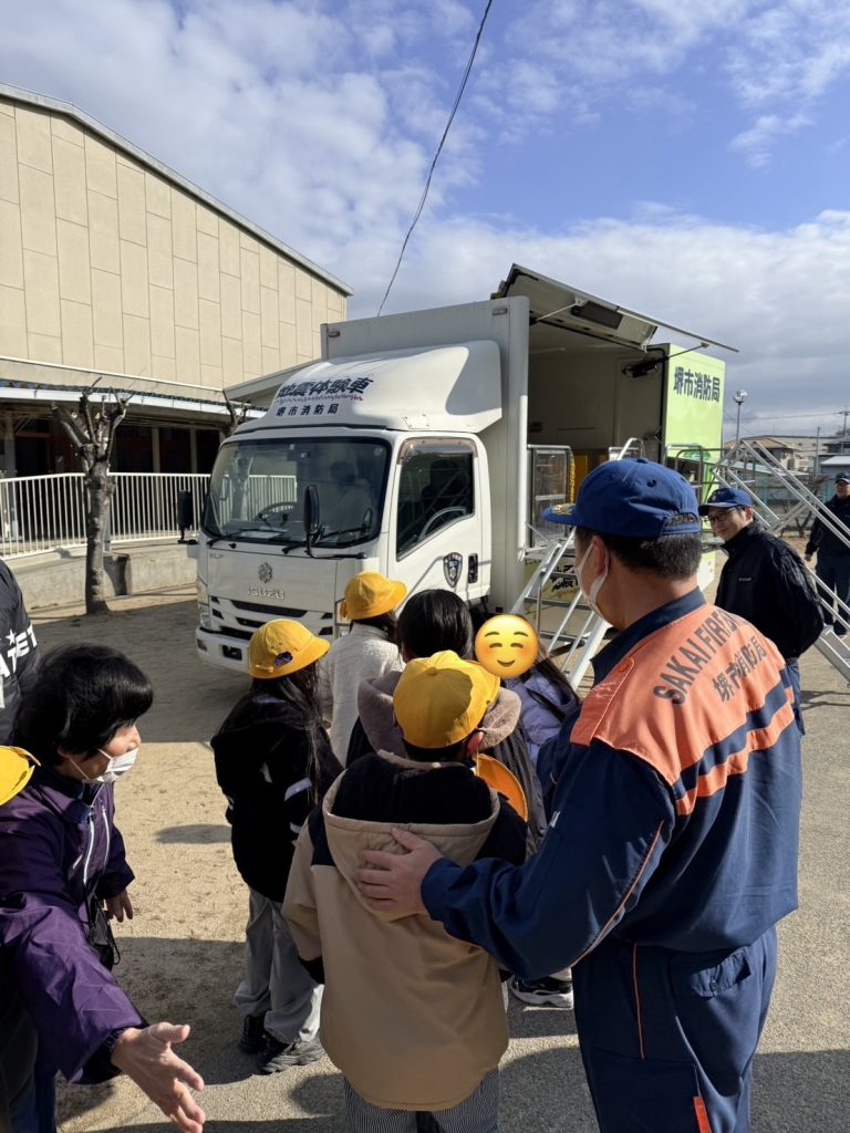 堺市消防局の皆さんと一緒に、地元の小学生へ『ワンタッチ式防災テント組立訓練』『地震体験車訓練』『AED訓練』などの防災学習をしました。